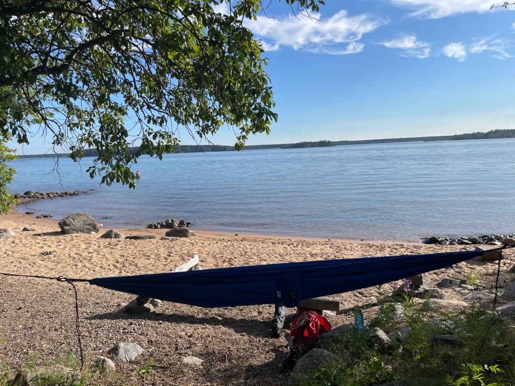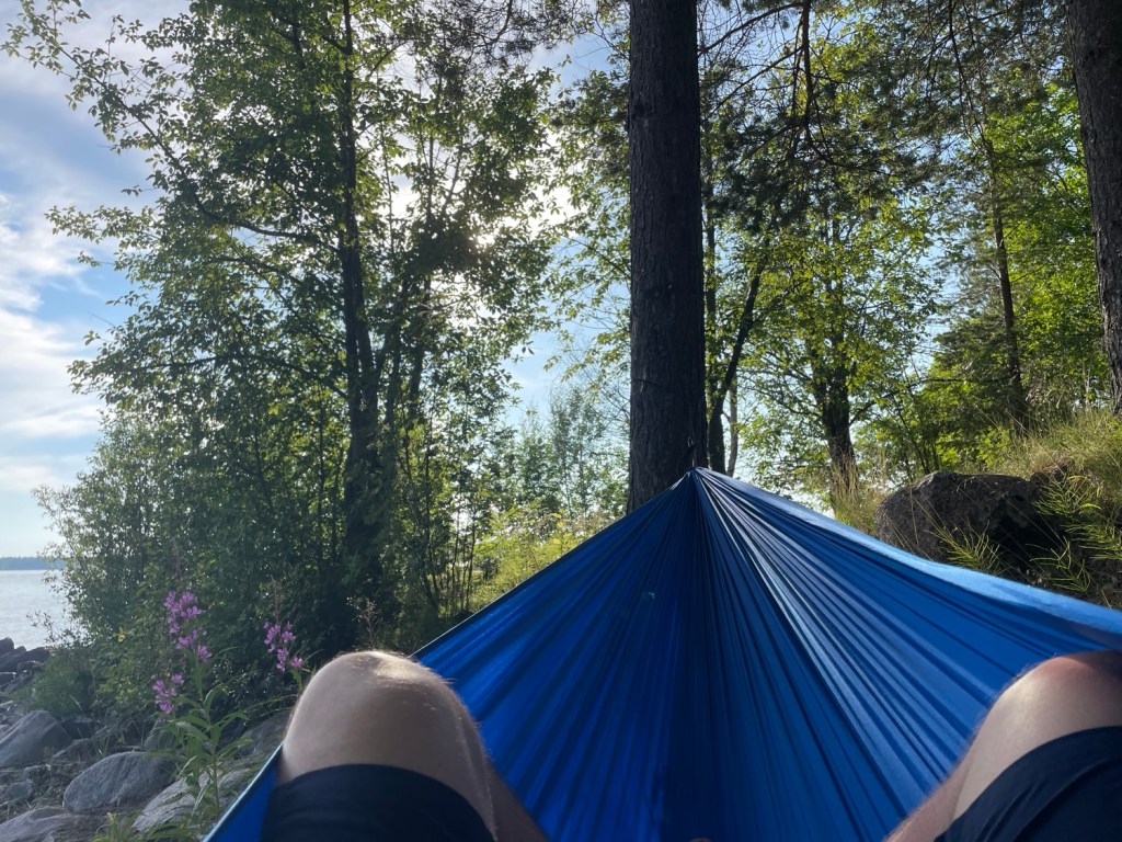 Klev sen upp i hängmattan. Den gungade lite efter jag kröp in i den. Jag hade min uppblåsbara kudde i den. Somnade nästan för en stund.