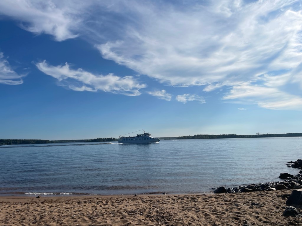 M/S Symfoni, turbåten som trafikerar Luleå Skärgård. Svallvågorna från färjan rullade sen in mot stranden.