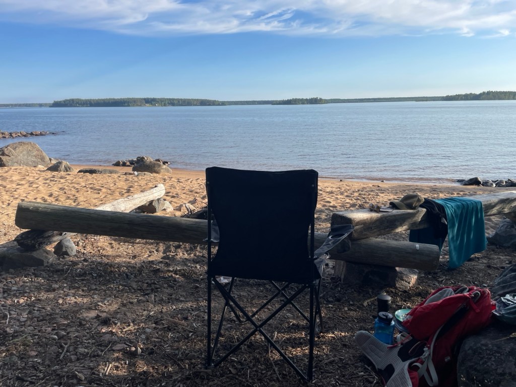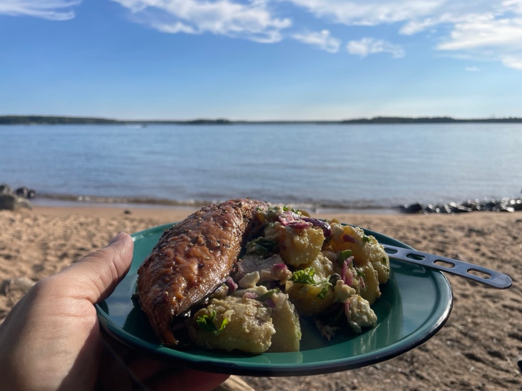 Hade hängt hemma hela dagen fast det var kalasväder. Hade i alla fall gått ut och tvättat sängkläder under förmiddagen då de var sjöblöta i svett efter nattens sömn. Kvicksilvret låg på 27 plusgrader. Bestämde mig senare under dagen för att äta middag vid min favoritbadstrand på Svartöbrinken. Inhandlade varmrökt makrill och tog med mig av den franska potatissalladen. Tog med mig både campingstolen och den enklare hängmattan. Började med att hänga upp hängmattan.