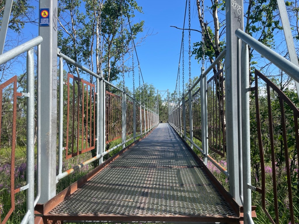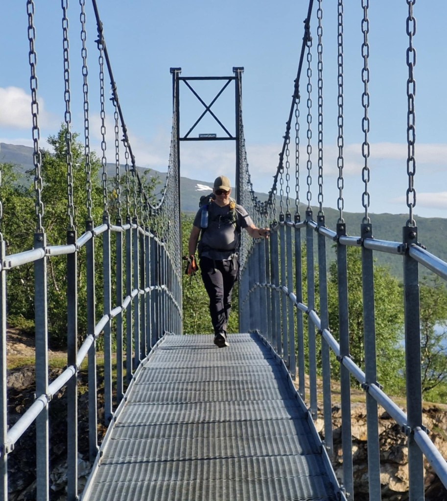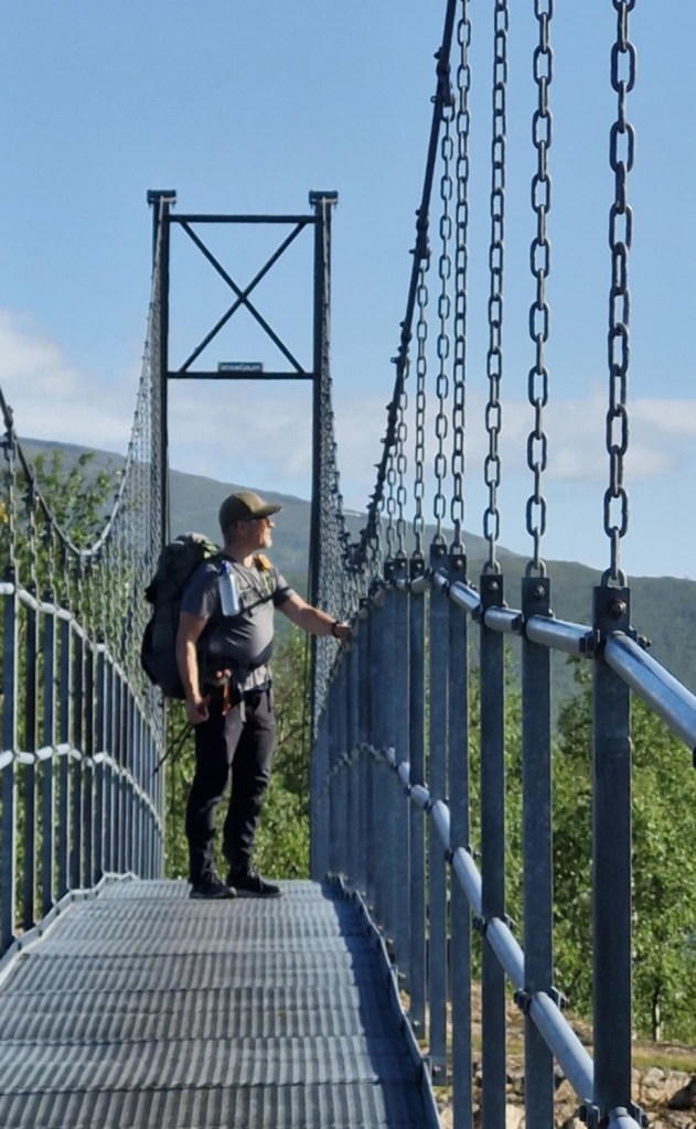 Jag gick i T-shirt. Vi passerade hängbron för att ansluta till Kungsleden och fjällens E4.