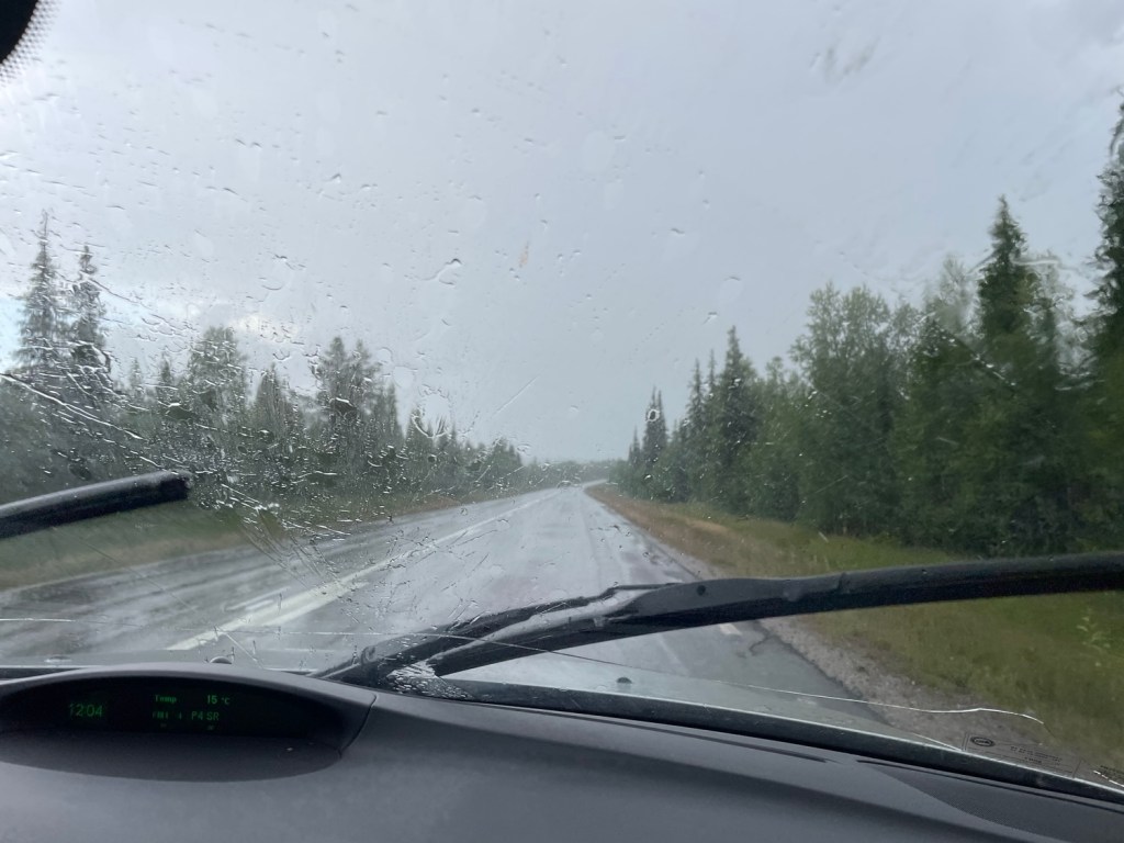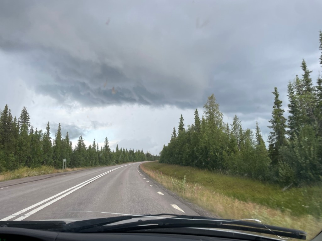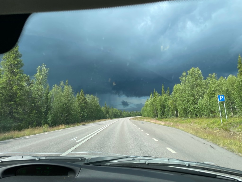 Roland hämtade upp mig hos mig. Vi körde från kusten på E4:an och vek av från E10:an i Överkalix för att undvika omfattande vägbyggen. Passerade mäktiga Jockfall och sen Tärendö med sin bifurkation. Vägen var renoverad och var riktigt fin. Innan Kiruna växlade vädret och vi körde in mot mörka moln. Vi såg blixtar och sen kom ett ösregn. Sen öppnade himlen upp sig.