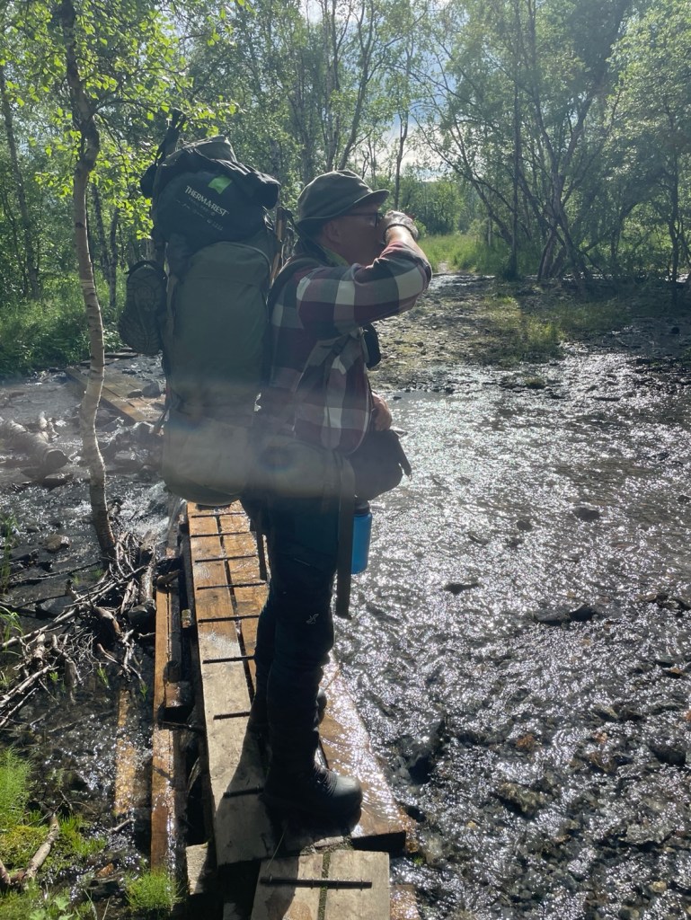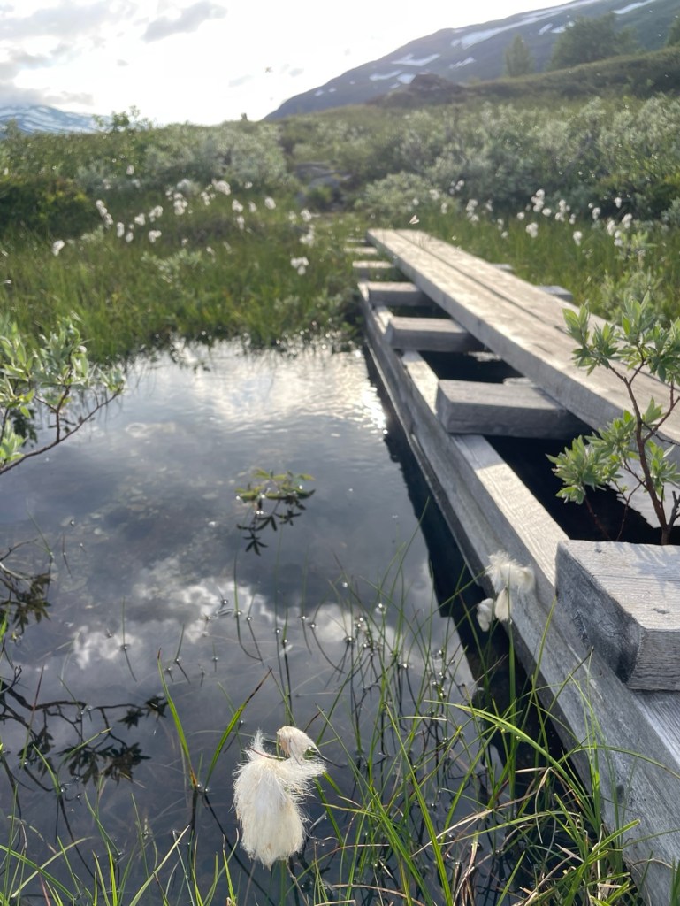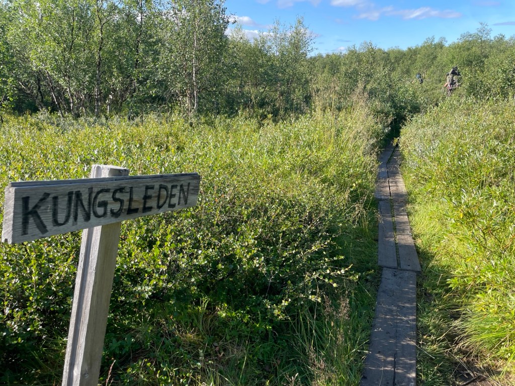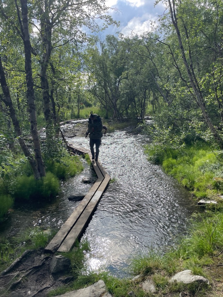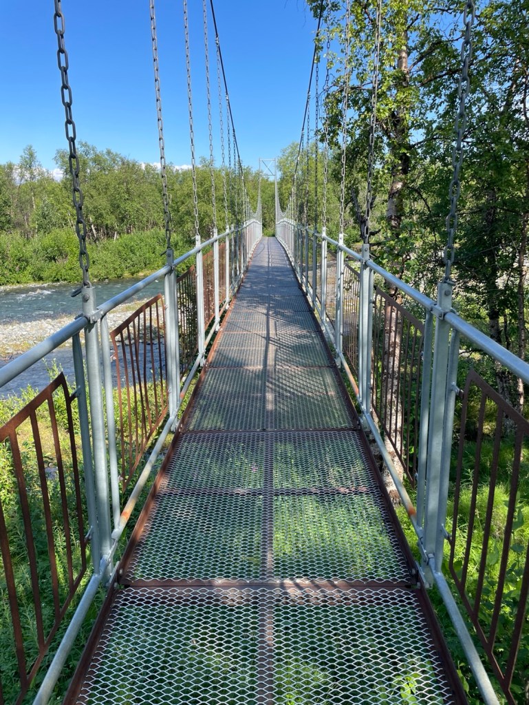 Vi gick över en till bro. Denna sträcka vi vandrade tillhörde både Kungsleden, Nordkalottleden och Dag Hammarskjöldleden.