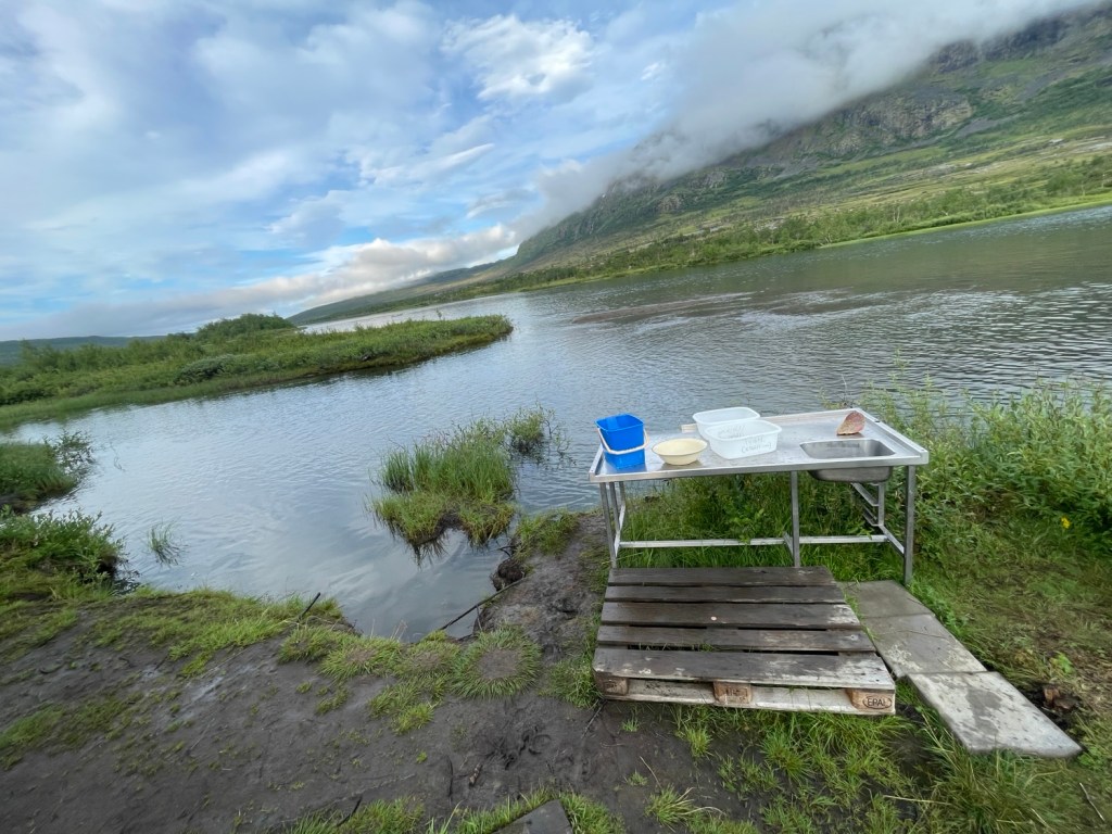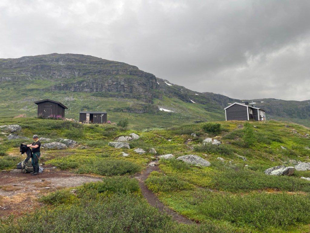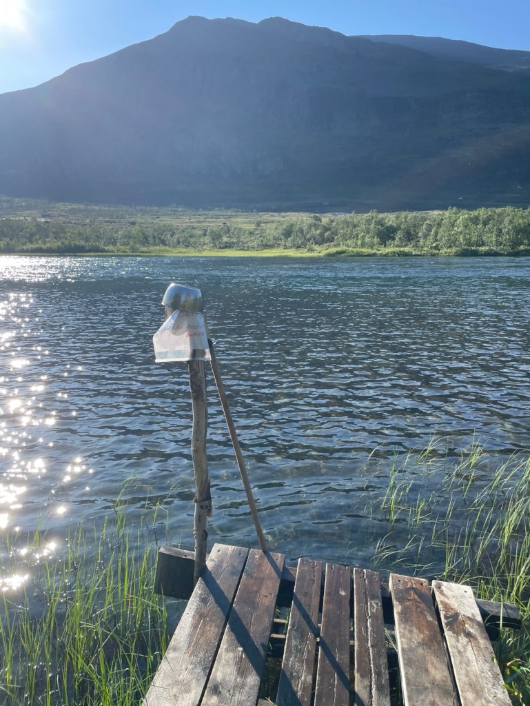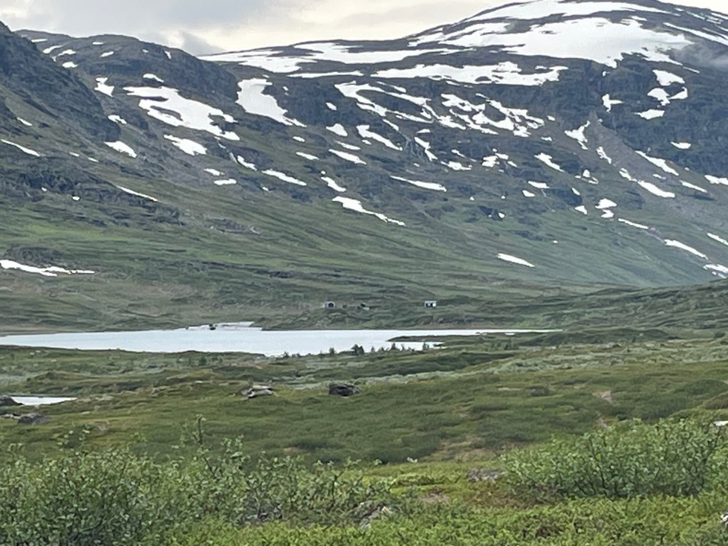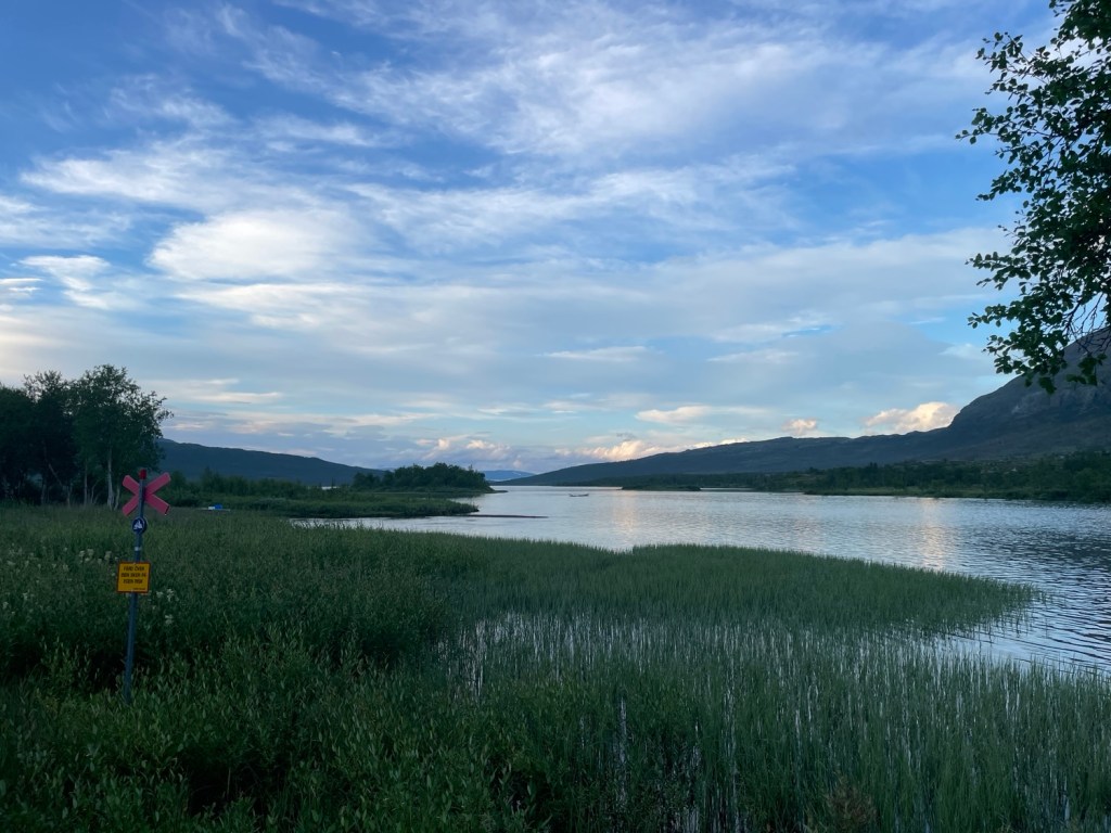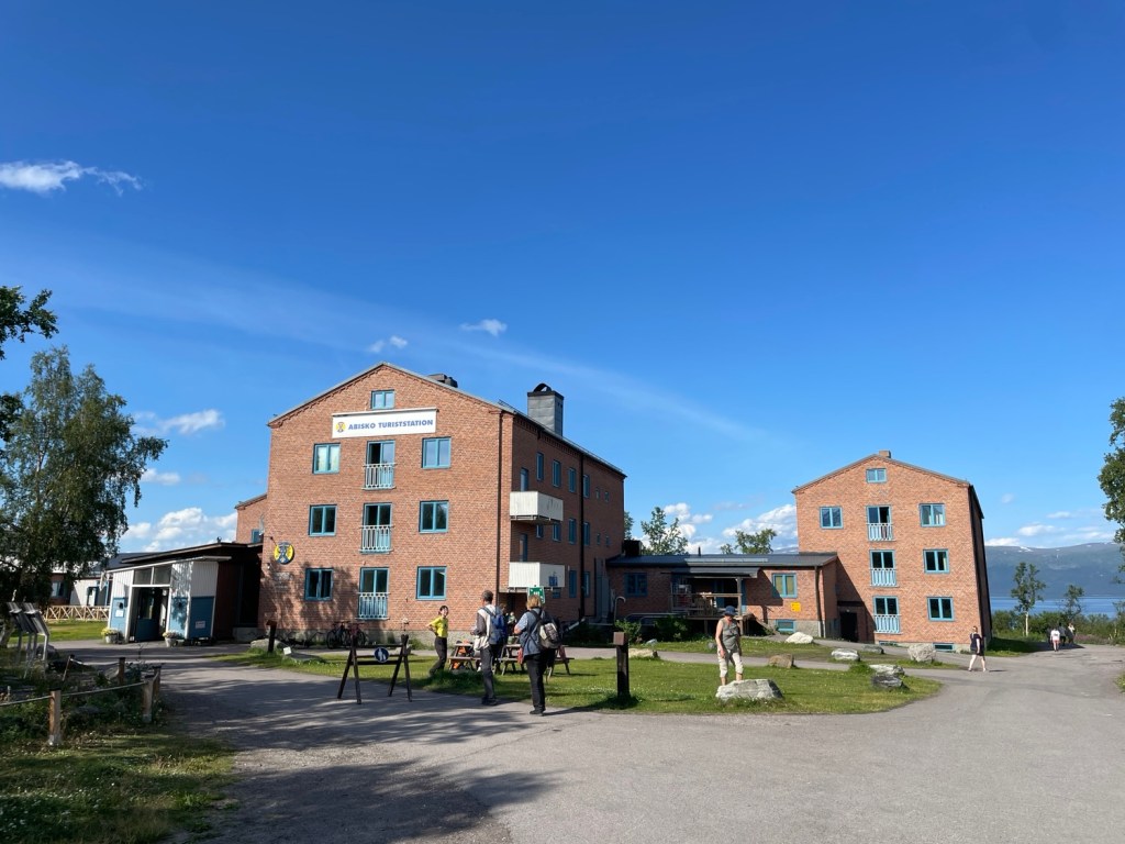 Vi kom till Abiskojaure och var inte sena med att boka varsin bädd i STF Abiskojaures fjällstugor. Det fanns några få platser kvar då det var många vandrare där. Vi skickade meddelande till stugvärden i Kårsavagge om det fanns en stig över berget men detvgjotde det inte. Som Roland sa så gick vi ”ledat, delvis ledat, oledat och Kungsledat”. Skönt att kunna torka alla blöta kläder inne i stugan. Vi bastade och jag tog två svalkande dopp i Abiskojaure. Lagade mat och åt ute tillsammans med en tysk som vandrade på Kungsleden ensam.