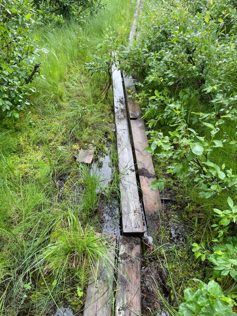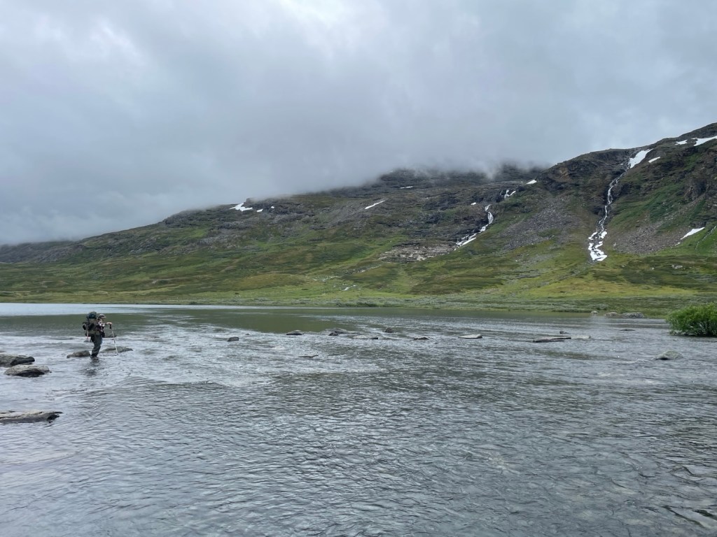 Vi passerade flera vad och leriga partier. Nu gick det inte längre hålla fötterna torra i mina trailrunningskor. Vi såg en par tält vid Kårsajåkka. Leriga och blöta partier fortsatte.