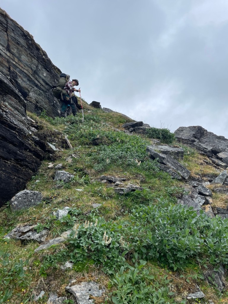 Det var stenigt och brant upp för gräsplätten. Roland försvinner upp mot himlen och där det planar ut.