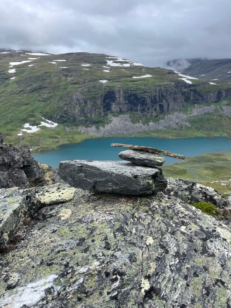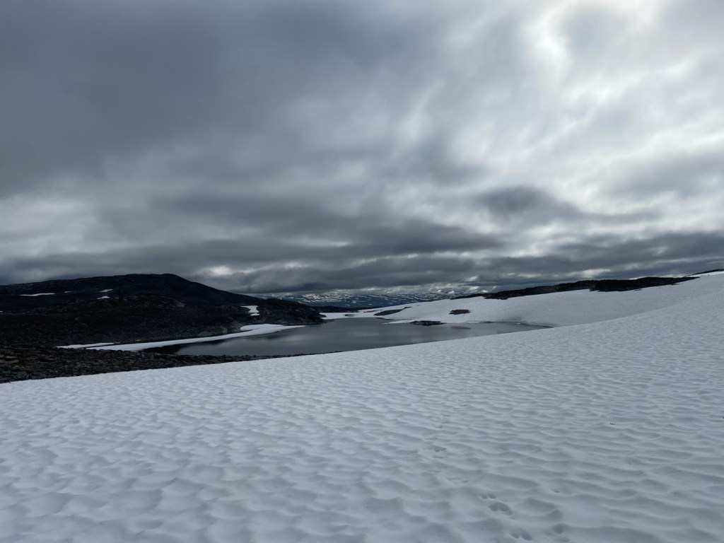 Vi kom till en liten sjö omgiven av snö. Stannade och lagade lunch och fyllde på vatten. Vi kontemplerade över situationen och insåg att vi inte skulle klara av att ta oss till Unna Allakas under dagen enligt vår plan. Sträckan dit var 21 km och oledad. Det hade tagit runt 2:40 för 3 km. Vi skulle behöva bestiga ett till berg på andra sidan Hoiganvagge. Vi bestämde att tälta någonstans efter toppen för att nästa dag vandra tillbaka med riktning mot Abiskojaure.