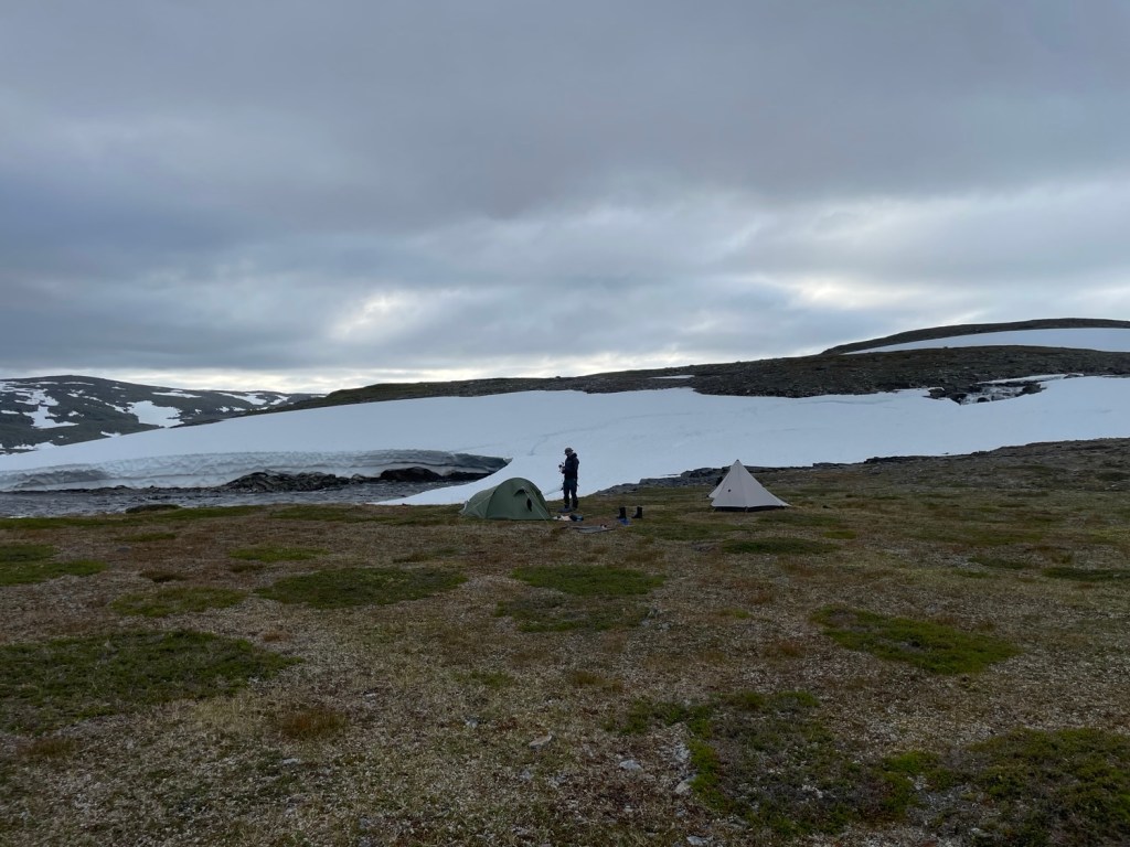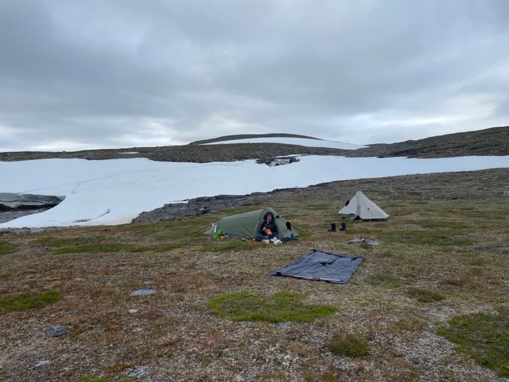 Vi traskade vidare mot stugvärdens stuga och en kvinna öppnade. Vi frågade henne om var vi kunde tälta och om det gick att gå till Unna Allakas över berget. Hon sa att vi kunde tälta bakom sovstugan mot jåkken och att det hade kommit vandrare senast torsdag från Unna Allakas. Vi tältade med utsikt över jåkken och lagade sen mat och åt vid en grillplats. Det fanns täckning uppe vid dasset. Vi drog oss sen tillbaka till tälten för en välbehövlig vila.