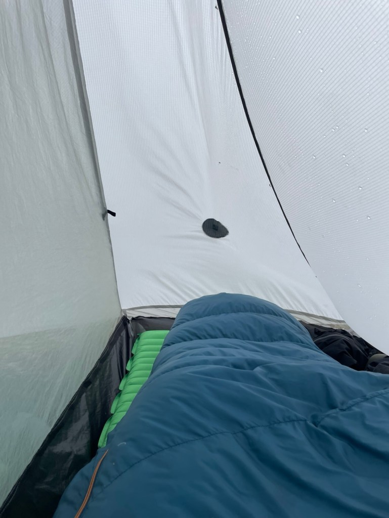 Det började blåsa hårdare under natten så det fladdrade i tältduken men tältet satt stadigt förankrat i marken. Regn började också falla under natten. Hade druckit så mycket vatten så jag behövde gå ut flera gånger och lufta blåsan i det kalla vädret.