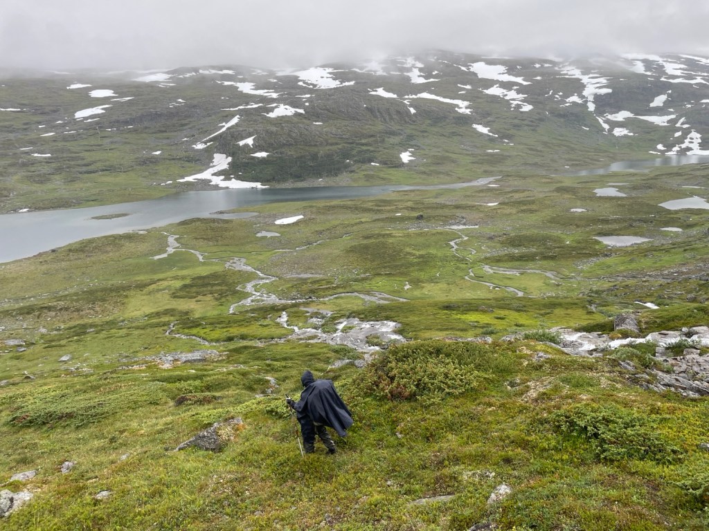 När vi passerade detta blöta och risiga område samt var nära Kårsavaggestugan började det regna så vi drog på oss regnkläderna. Roland med sin regnponcho och jag med mina skalkläder.