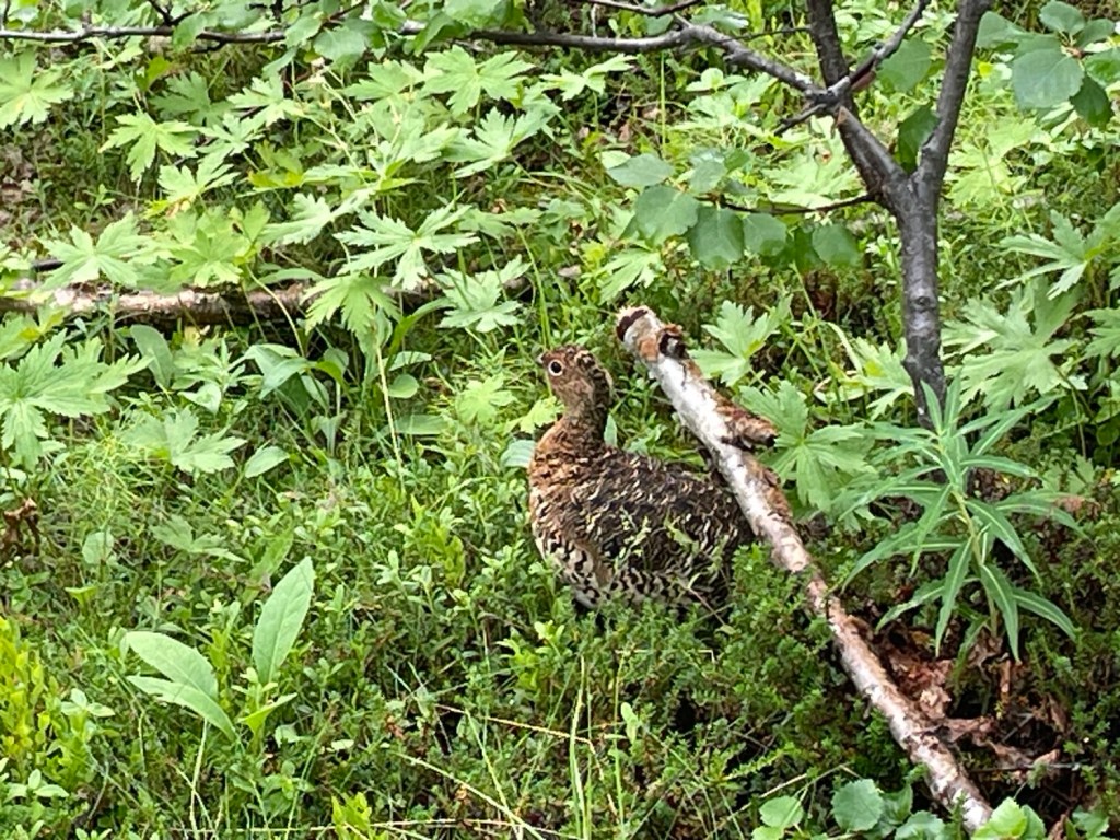 En riphöna med bruna fjäderdräkt och röda markeringar under ögonen. Det var första gången jag sett en ripa på så nära håll.
