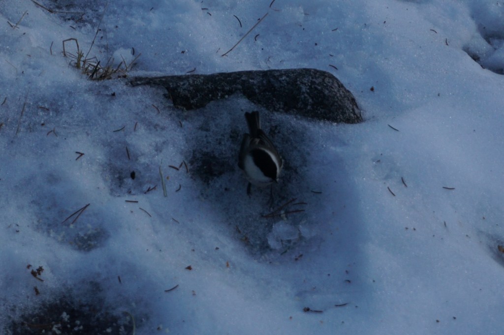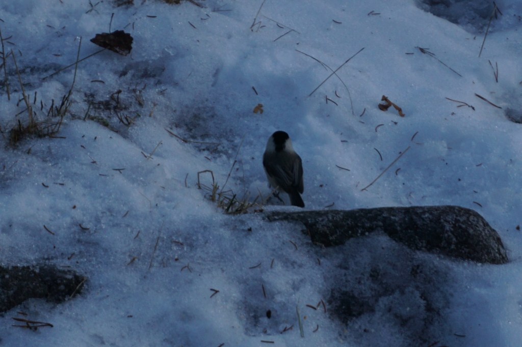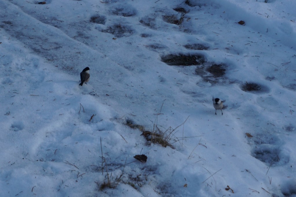 Det flög två nyfikna och oblyga talltitor nedanför bänken. De hittade något att äta på snön.