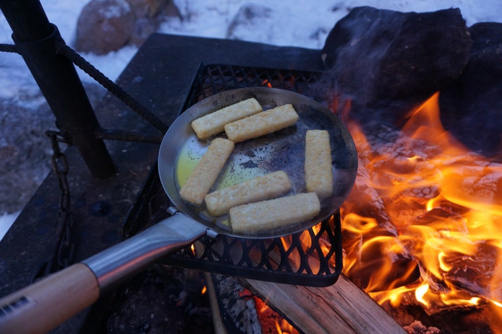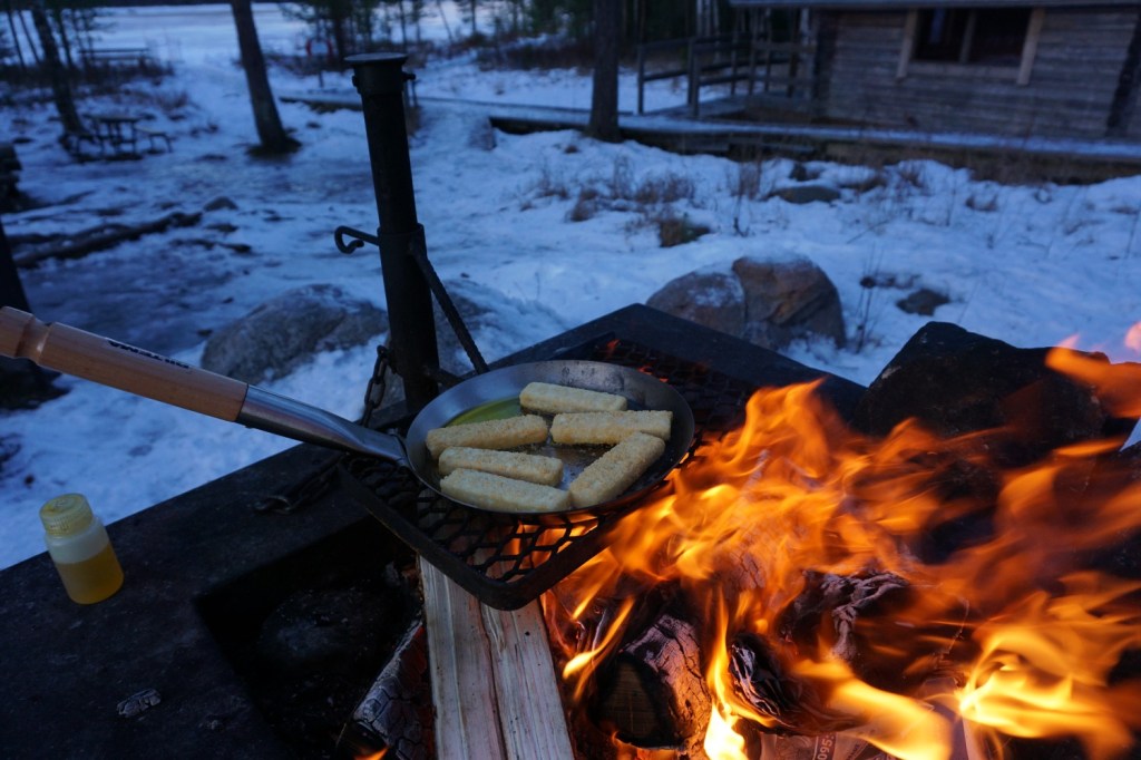 Det var dags för mig att laga något att äta. Jag fick ta över brasan från en familj. Stekte fiskpinnar över elden.
