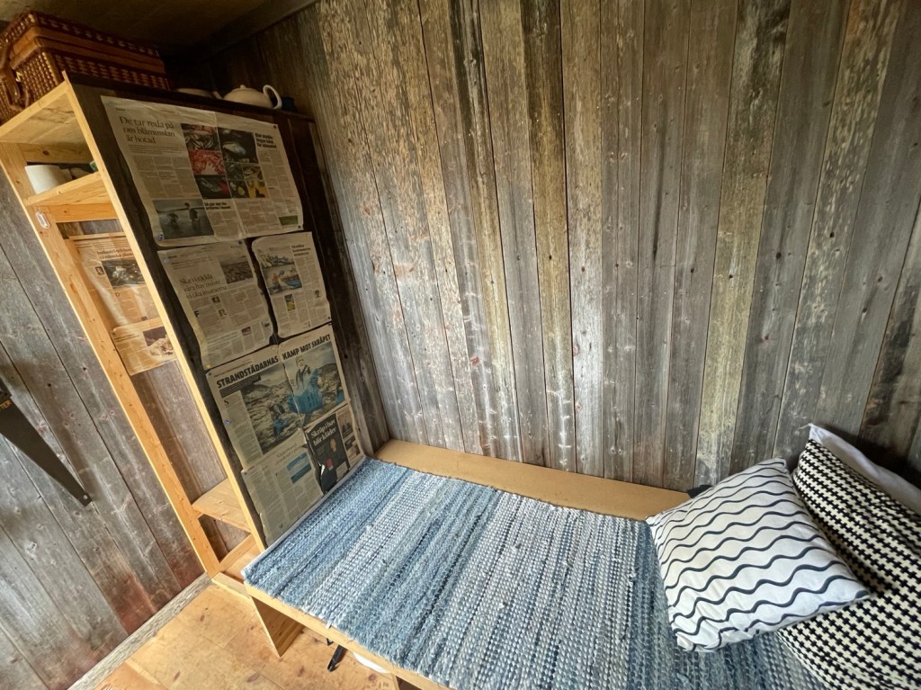 Kom till en liten stuga som kallades eremitens koja och är en installation med syfte att stanna till vid för återhämtning, reflektion och att vandraren inbjuds att städa stranden från skräp.