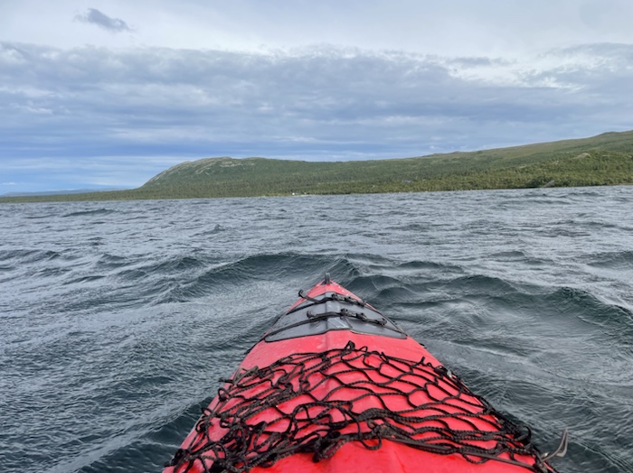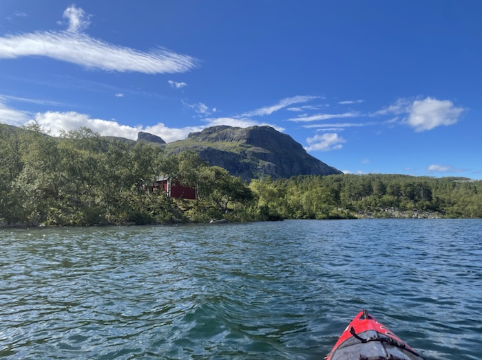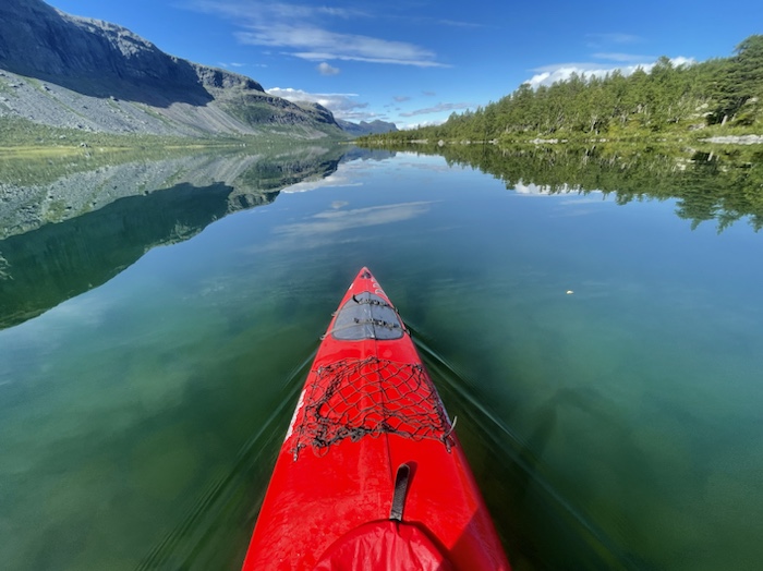 När jag kom till receptionen vid 12 kunde jag inte ännu få tillgång till rummet så jag valde att hyra en kajak och paddla mot Stora Sjöfallet innan tvårätters middagen serverades 17:30. Vid stranden fick jag hjälp av två vandrare varav en norsk man sköt ut mig i det spegelblanka vattnet. Jag kom inte riktigt överens med positionen med benen även fast jag skjutit fotpedalerna längst fram. Sittbrunnen kändes lite trång. Det var härligt att paddla igen i en havskajak och jag fick den där wow-känslan igen. Jag hade ingen exakt plan vart jag skulle paddla men tänkte nå Stora Sjöfallet om möjligt för lunch.