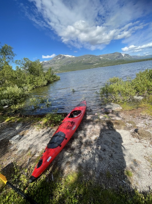 Landsatte kajaken på en liten skyddad strand vid Sjöfallsstugan