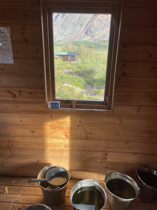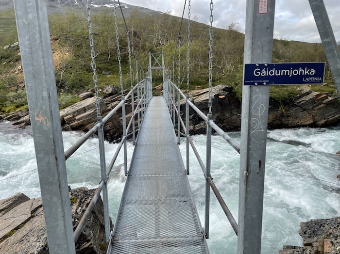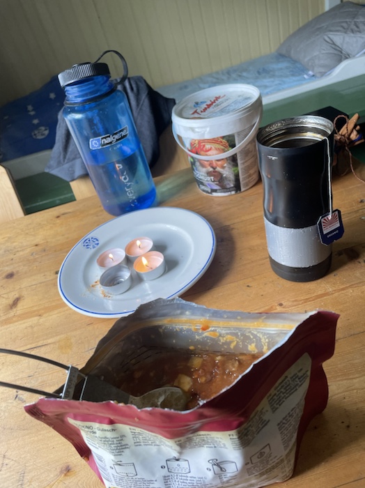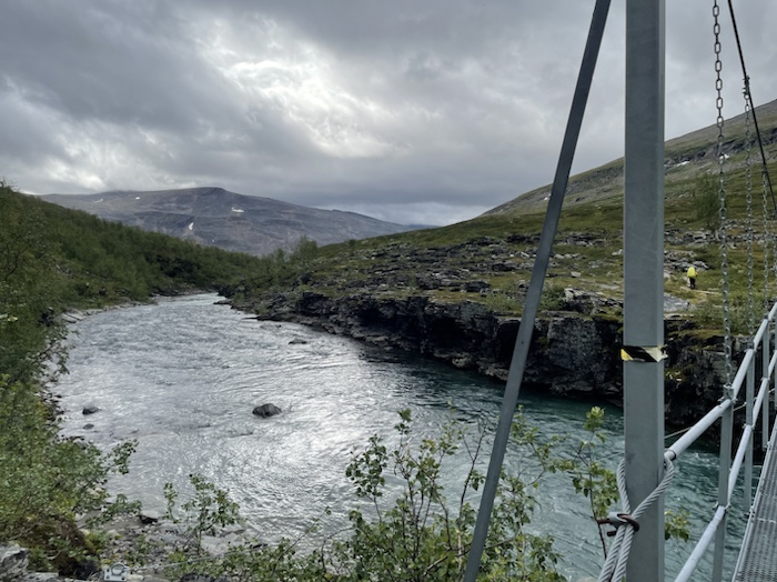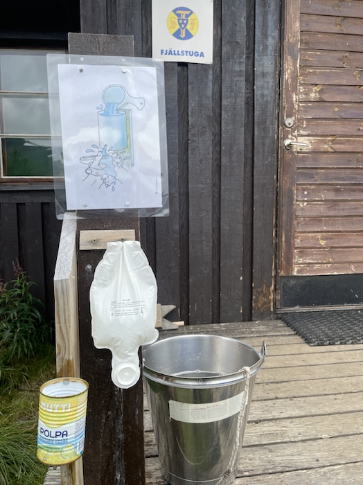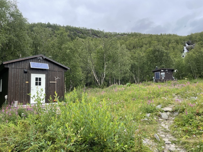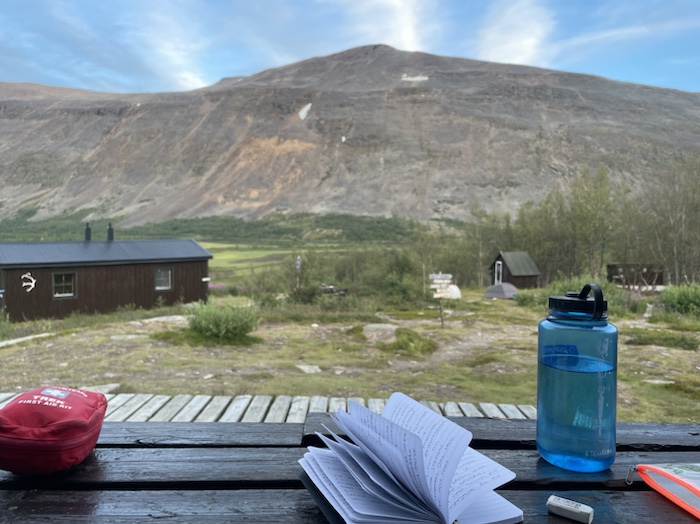 Efter bastun satt jag ute och skrev i dagboken. Hörde den brusande jåhkken, fågelkvitter och myggorna sög mitt blod på händerna. Första gången på den här turen jag märkte av myggor. Stugvärden gick runt och tittade till i fjällstugorna. Frank blev inspirerad av mig att äta bönor eftersom jag ätit en frystorkad rätt som kallades five bean casoulet. I mitt rum sov också en kvinna från Estland och en kvinna från Frankrike. De var ett gift par. De skulle upp kl. 5 så de ställde ut sina ryggsäckar i allrummet för att inte störa mig på morgonen.