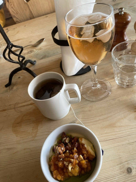 Efter det fick vi hämta desserten, en pannacotta med hjortron, nötter och granskottsolja. Den var likaså god.