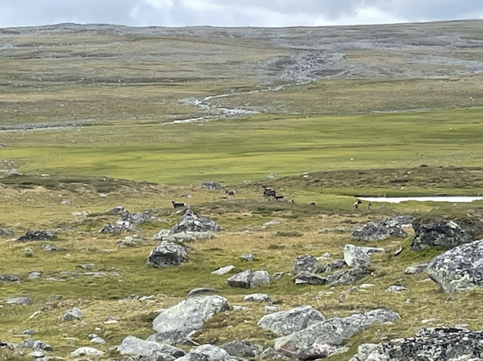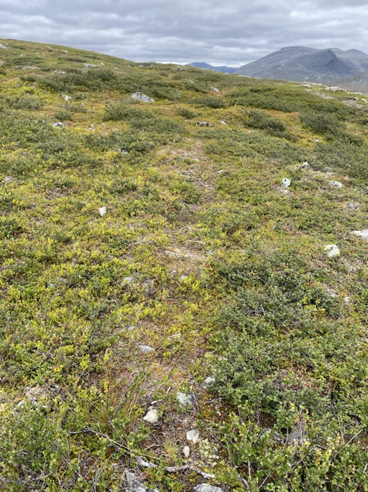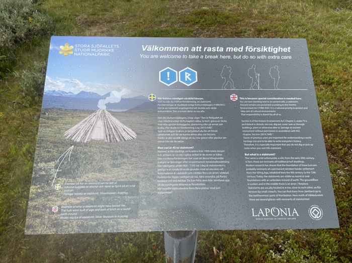 Efter 1,6 km brant stigning och stigningen började plana ut uppenbarade det sig gräsytor. Jag kom till en skylt att det på denna plats funnits stalotomter som troligen var lämningar efter permanenta renskötarbostäder under vikingatiden.
