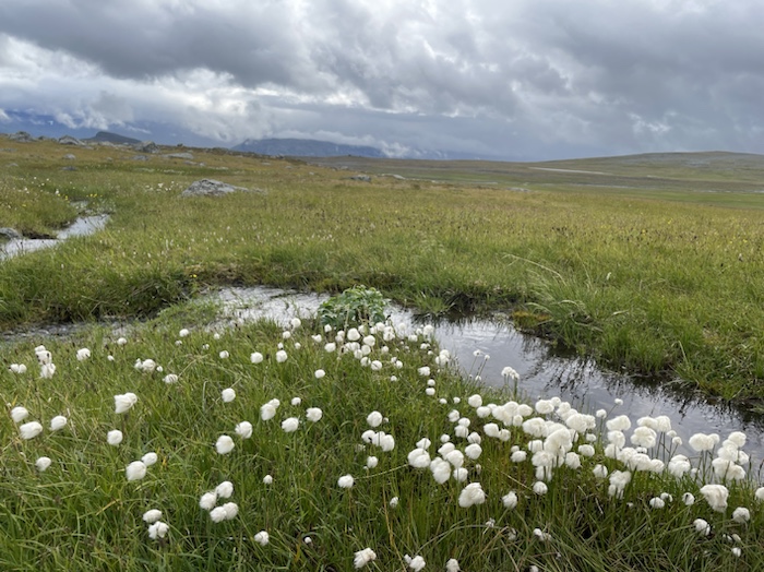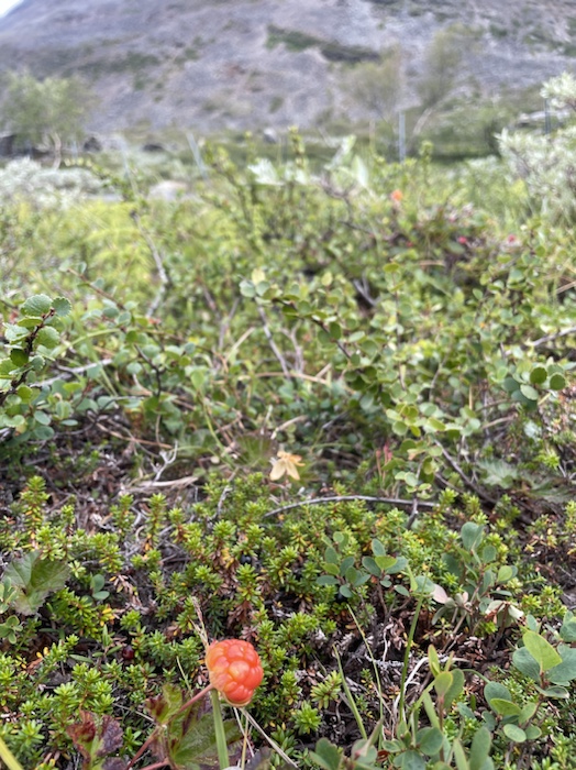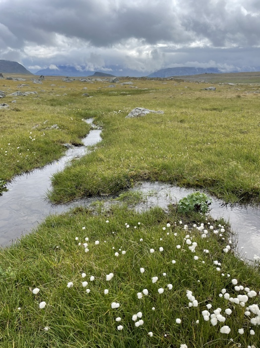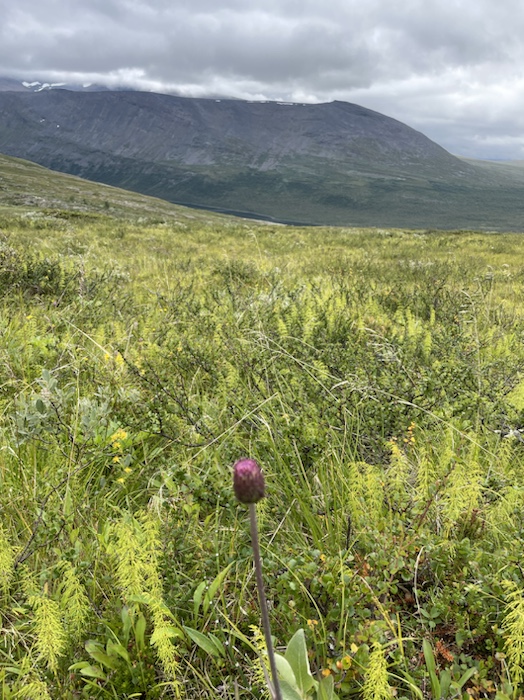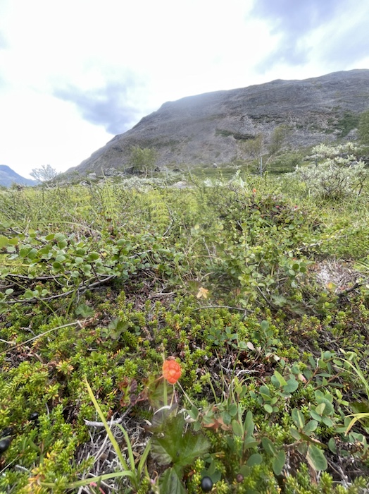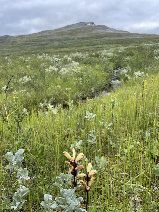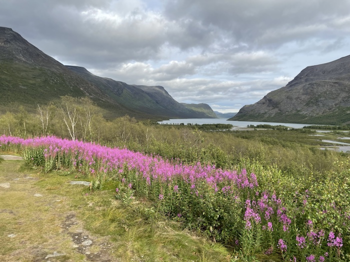 Hörde en korps kraxande eka över dalen och såg flera vandrare nere på Kungsleden. Vandrarens bästa vän pep då och då på långt håll, ljungpiparen som den heter. Det var en stor blomsterprakt efter bergssidan. Det blev lättare att gå högre upp. Buskarna minskade och en hel del kråkbär växte där.