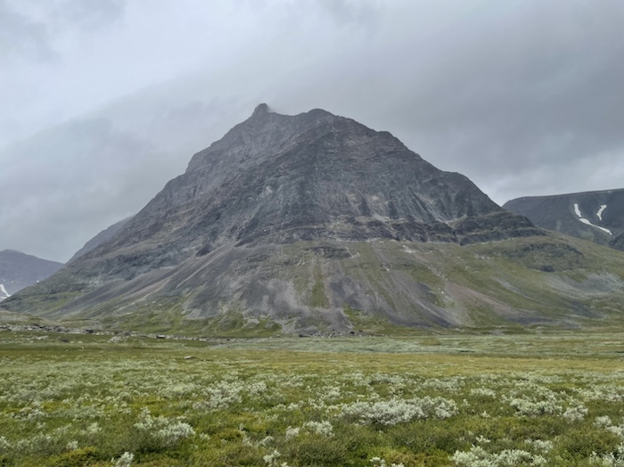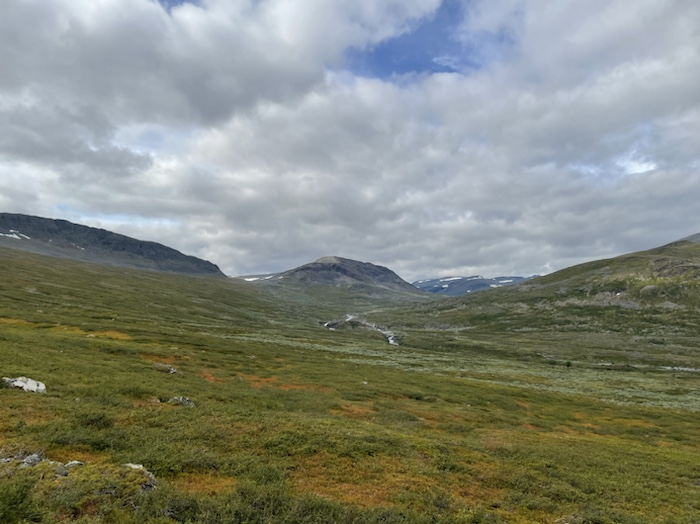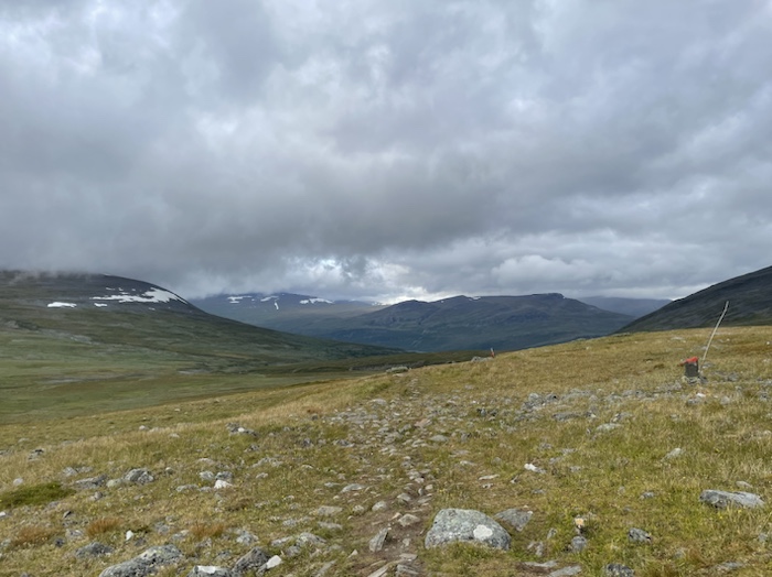 När landskapet öppnade upp sig mot Singi kom sången ”I natt jag drömde” upp i huvudet men jag kom inte ihåg texten i övrigt. Strax efter kom repliken ”Time to die” från Ridley Scotts långfilm Bladerunner. Det var lustigt hur tankarna kom och gick under vandringen. Strax efter mötte jag en ung man med en systemkamera på ryggsäckens bärrem. Han siktade på att vandra hela Kungsleden från Abisko och filmade en hel del som han skulle klippa ihop till en kortdokumentär.