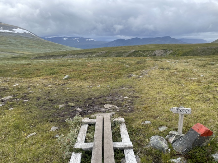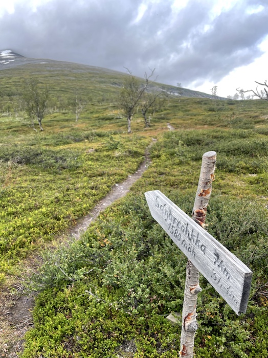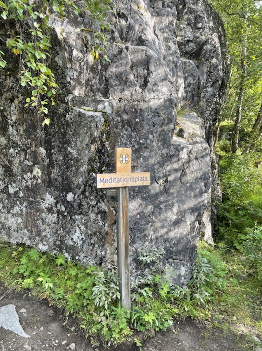 Från Abisko till Nikkaluokta går Dag Hammarskjöldleden som är en pilgrimsled. Det finns sju meditationsplatser längs leden med korta texter från Dag Hammarskjölds efterlämnade anteckningar. Jag stötte på en meditationsplats med text som mannen från Huddinge och jag läste på stenen: