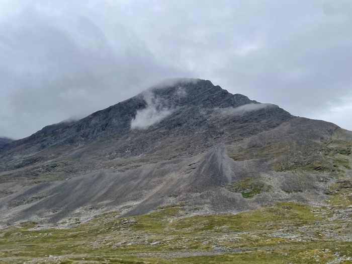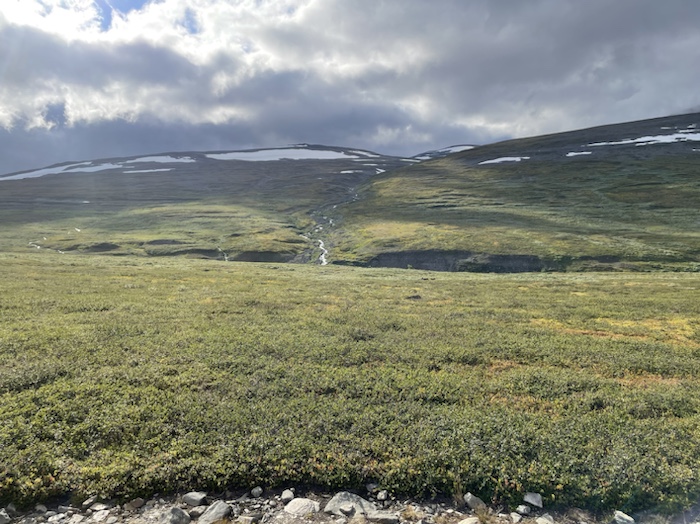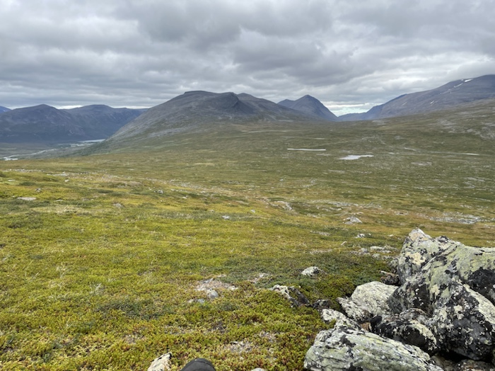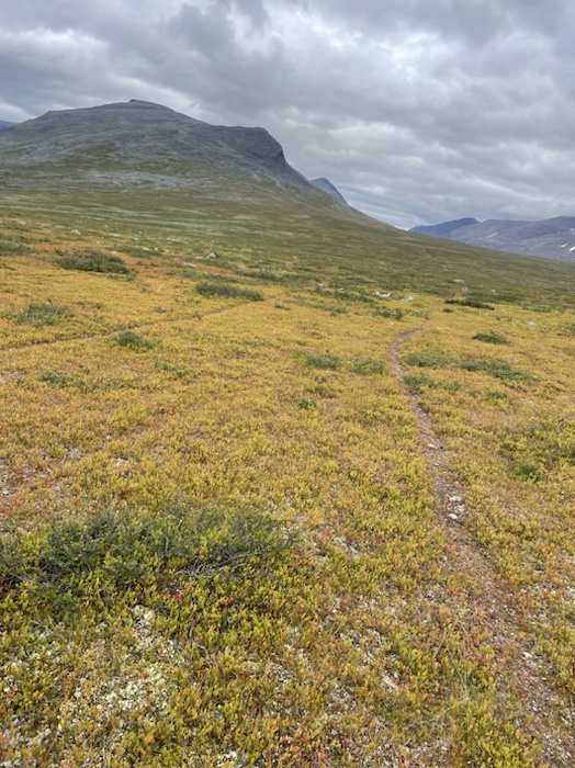 Strax efter bron vek jag av från Kungsleden och siktade upp mot berget. Det var snårigt i början av vandringen med enbuskar, björkbuskar, stenigt och blött men sen blev det mer öppna gräsytor högre upp.