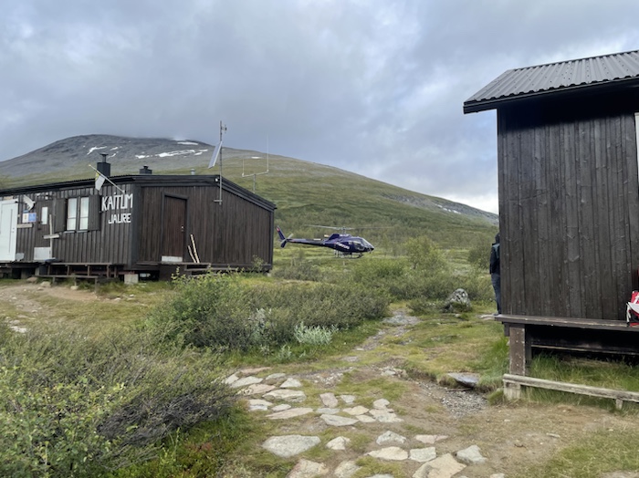 En helikopter kommer med personal från Länsstyrelsen som lagar och bygger på spängerna