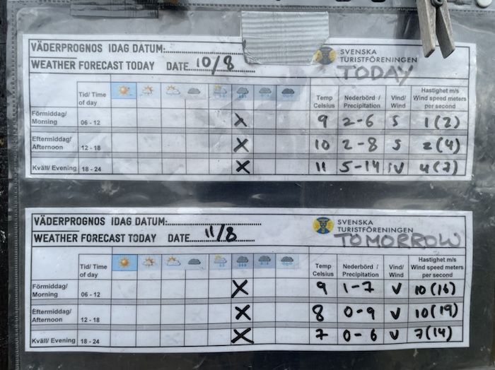 Den kvinnliga stugvärden satte upp den aktuella väderprognosen. Det skulle börja regna under dagen och blåsa upp under morgondagen. Sen började jag min vandring mot Kebnekaise med än mer molntyngda bergstoppar.
