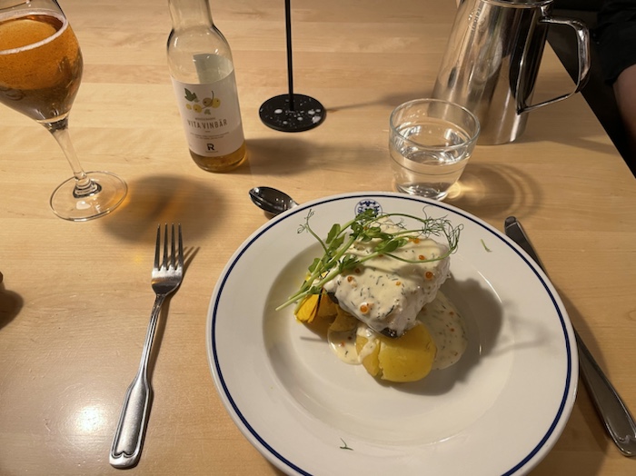 Vid bordet satt två kvinnor från Oslo och Tromsö. De hade vandrat åtta dagar genom Sarek och Rapadalen och längtade nu efter lagad mat. Sen kom en 72-årig herre från Luleå till bordet som sålde in Luleå till kvinnorna. Huvudrätten var ugnsbakad sik med rostad potatis och rödbetor, skirat smör och inlagd gurka och fänkål. Det var riktigt gott.