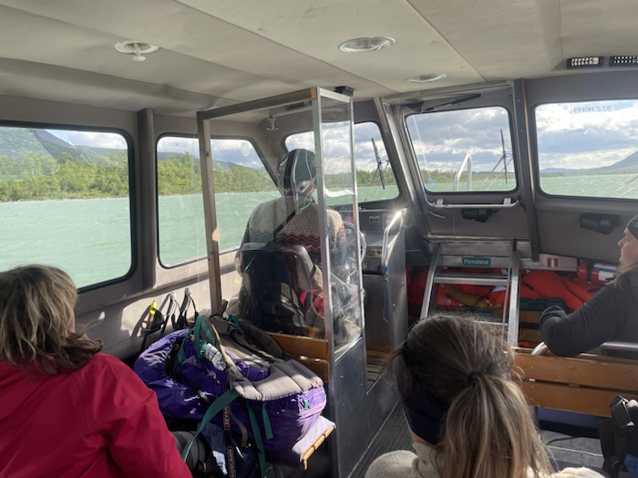 Väl på båten hamnade jag bredvid tre äldre damer som var tvungna att avbryta sitt planerade äventyr en bit in i Sarek. En av kvinnorna hade mötts av en anhörigs sjukdomsbesked. Två av dem skulle åka tillbaka och en kvinna skulle åka till Akka eftersom hon tänkte använda sin lediga vecka. Hon hade sagt till en person att det var en fin sjö Akkajaure och fick till svar att det var inte en sjö utan en damm. Hon hade mött en kvinna Elin Anna Labba som skrivit om tvångsförflyttningarna i boken Herrarna satte oss dit-Om tvångsförflyttningarna i Sverige. Labba fick Augustpriset för boken. Det ska finnas en kopia av boken i Vaisaluokta. Kvinnan sa att Labba skriver på en ny bok om hur människorna påverkades och upplevde Akkajauredammen. Vid Kebnats och i väntan på bussen till Vakkotavare mötte jag en ung man från Tallin i Estland som sagt upp sig från jobbet och skulle bland annat vandra hela Kungsleden. Hans flickvän hade fått ont i ryggen så hon behövde vila vid Kvikkjokk. Hon skulle ansluta med honom vid Kebnekaise. Denna dag var det söndag och på måndag skulle han vara vid Kebnekaise. Han skulle också vandra i Transsylvanien så han skulle behöva packa vitlökar och spetsiga pålar i packningen.
