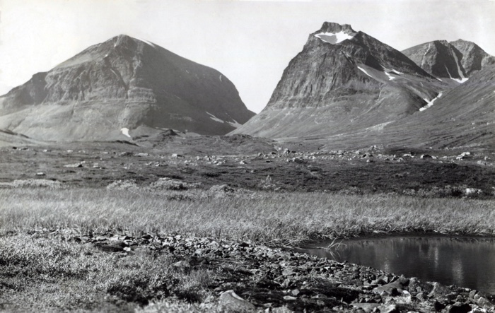 Gick in till stugan och lagade en frystorkad rätt. Bjöd på rökt renhjärta till Eric och Christopher. Jag skrev i min dagbok efter middagen. Gick sen ut och träffade stugvärden Marcus. Jag visade min bild från morfars fotoalbum när dom tältade med berg i bakgrunden. Han pekade direkt mot bergskammen på Unna Avrrik. Mycket riktigt jag kände igen knölen på bergskammen. Det var så molntyngda bergstoppar att det var en utmaning för mig att identifiera vyn. Gick ner mot vattnet men lyckades inte hitta den exakta tältplatsen. Bergen kändes igen i alla fall. Det var en upprymd känsla att hitta motivet från där morfar tältat på 40-talet.